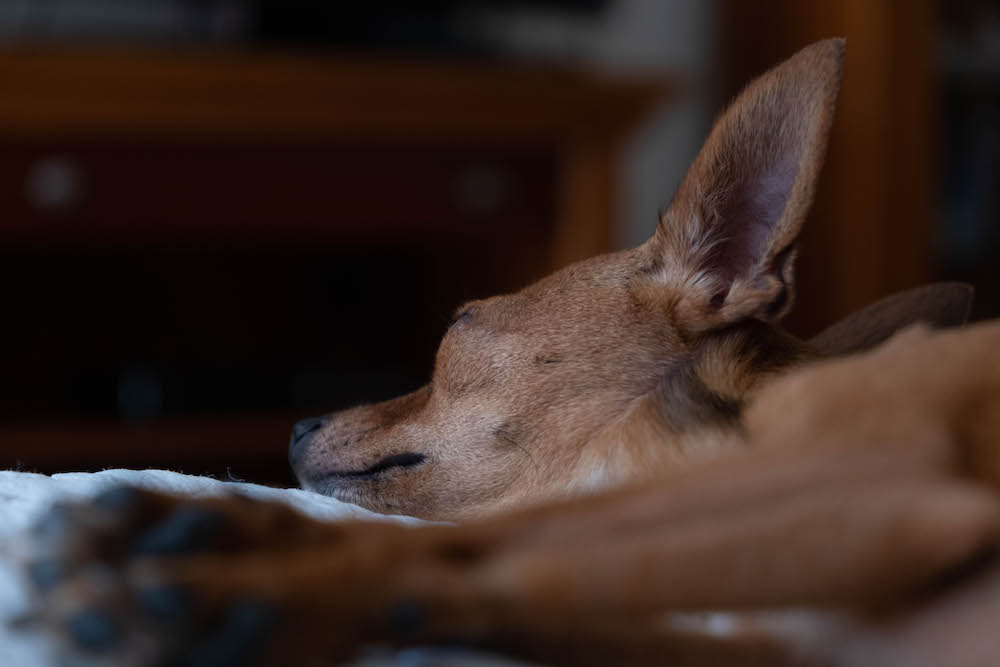 Nessa noite, como a cadela não parava de choramingar, o Santiago foi dormir com ela para o sofá. Dormiu aninhada ao colo dele e parou logo de chorar. Na manhã do dia seguinte, estavam os dois a dormir no sofá e com a cadela em cima dele.